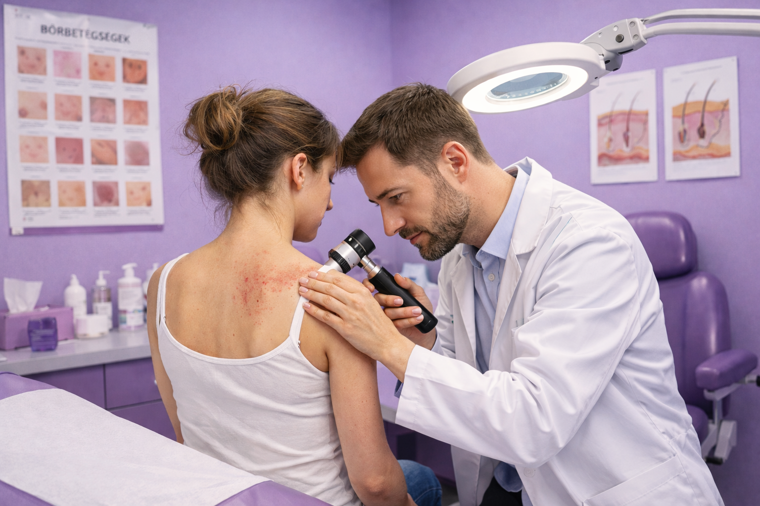 - Mintavétel: A bőrgyógyász mintát vesz a bőrfelületről, hogy diagnosztizálja a bőrfertőzéseket, például gombás fertőzéseket, vagy szexuális úton terjedő betegségeket.
